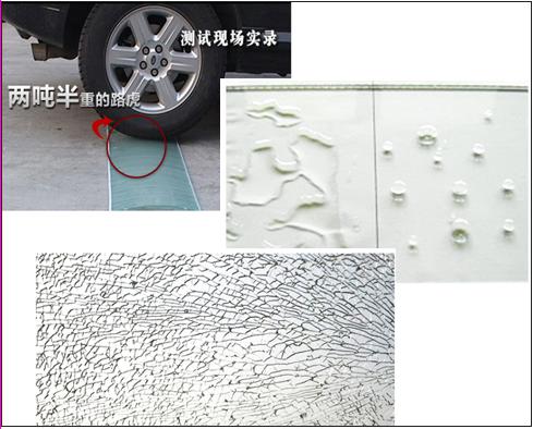 兩噸重的汽車在鋼化玻璃下壓力,玻璃沒有發(fā)生變化。強(qiáng)度:提高鋼化后玻璃的機(jī)械強(qiáng)度,抗沖擊性,抗彎強(qiáng)度是普通玻璃的4-5倍。