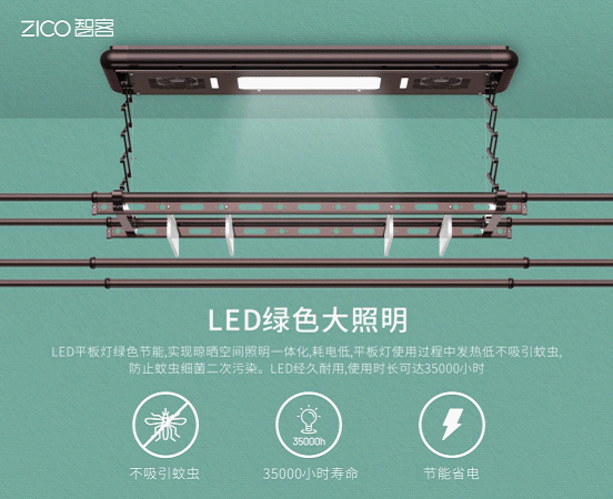 隨著LED照明技術(shù)升級(jí)和普及,家居照明燈飾、汽車照明等都用上了壽命耐久、光照亮度更佳、更加健康護(hù)眼的LED光源,如今智能晾衣機(jī)也不例外,響應(yīng)綠色環(huán)保的號(hào)召。ZICO智客的LED燈板與機(jī)身融合一體,發(fā)光柔和舒適,發(fā)熱低不會(huì)吸引蚊蟲、避免蚊蟲攜帶細(xì)菌污染衣物,LED燈源有35000小時(shí)的使用壽命、電機(jī)耐用達(dá)20年之久。