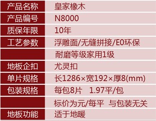 消費者對此產品的評價非常高,在圣象天貓商城每天前來網購的人非常多。它具有超強的防水、防磨、防滑效果等效果。圣象皇家橡木N8000地板色澤呈現溫馨的暖色,木紋清晰,仿實木效果非常逼真,特別適合喜歡實木又害怕麻煩的人士。環保指數非常高,這款產品不含有甲醛,家里有寶寶的也不擔心,可以放心讓寶寶在上面爬行。