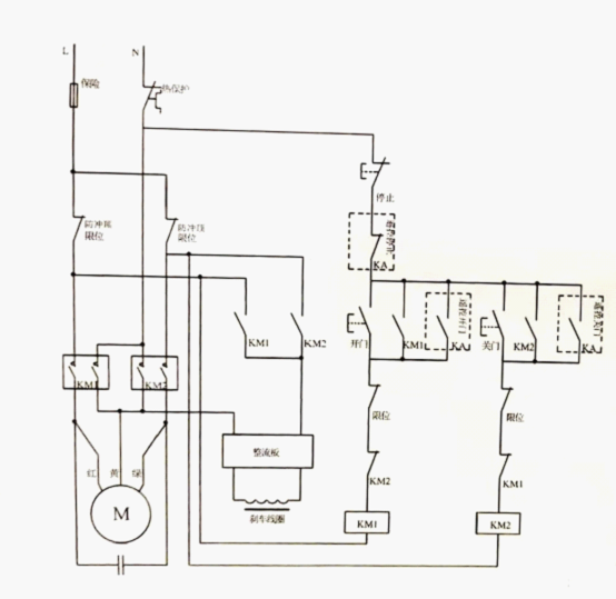 工作原理:當按住手動按鍵開關的開門鍵時,交流接觸器KM線圈得電吸合工作。直流電磁線圈得電,磁鐵動作,使制動離合鏈盤松開脫離,卷簾門電機正常工作運轉。當按下手動停止鍵時,交流接觸器線圈失電,此時不管是卷簾門電機在處于開門或者關門狀態,制動離合鏈盤合攏(剎車)緊緊壓住制動,卷簾門電機停止工作。