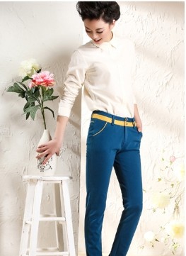 早春糖果系列的打扮,白色的襯衫+藍色的褲子,整體給人干練之感,無需要其他過多的裝飾,只需一條簡單的腰帶已經能把這一身搭配得更有女人味,女王風范十足。