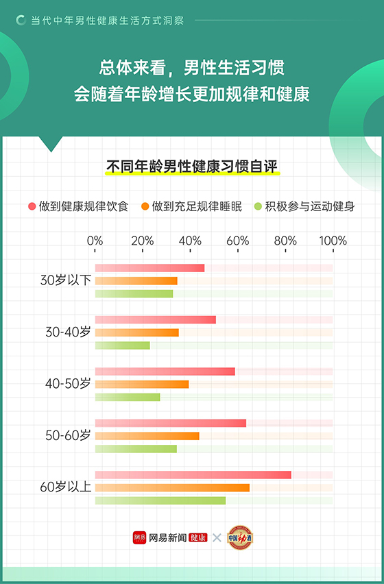 隨著年齡增長,男性生活習慣更加規律,中年男性比年輕人更懂好好吃飯、好好睡覺。約六成(60.5%)中年男性認為自己飲食規律且健康,不僅自己吃的更健康,愛在家庭群、朋友圈分享健康飲食知識。其中40-60歲的中年男性相比40歲以下的男性人群更注重規律飲食、餐食的葷素營養搭配,有意減鹽少油,也更注重健康適度飲酒。