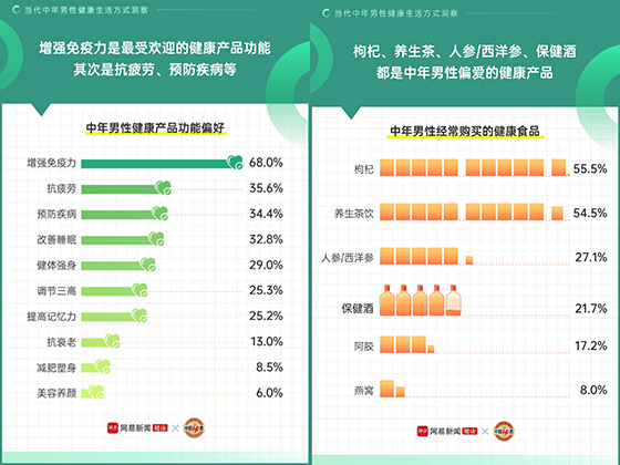 除了運動養生,在健康食補產品的選擇上,近七成中年男性更偏愛可以增強免疫力的健康產品,枸杞、養生茶、保健酒成了養生三大件,其中月收入1-2萬元購買保健酒的比例最高。增強免疫力是最受歡迎的健康產品功能,其次是抗疲勞、預防疾病等。