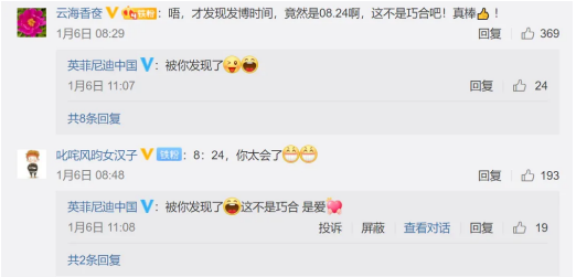 英菲尼迪還悄悄準備了個小驚喜,發博時間8點24分是張若昀生日,卡點發博是飯圈非常熱衷的應援方式,英菲尼迪的小驚喜發出就被粉絲發現并大加稱贊。隨后張若昀也卡點英菲尼迪“生日”11點08分發了微博,這個雙向奔赴的小驚喜無疑使粉絲們的傳播熱情更上一層樓。