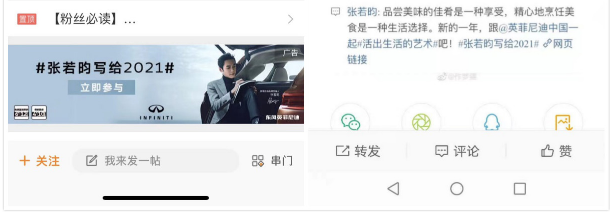 在2021年開年,英菲尼迪再度攜手微博進行開年首秀,并邀請品牌代言人@張若昀 拍攝品牌TVC,與用戶一起探尋生活的藝術。