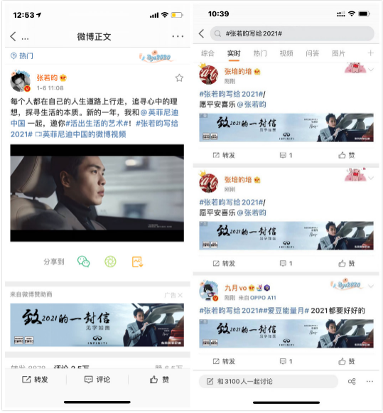 張若昀直發視頻博通過粉絲頭條精準推薦給更多興趣用戶;視頻發布當天,張若昀所有微博下面都會出現“致2021的一封信”banner;用戶帶話題詞#張若昀寫給2021#發博都可以觸發全彩語義詞card,英菲尼迪霸屏搶占用戶目光。