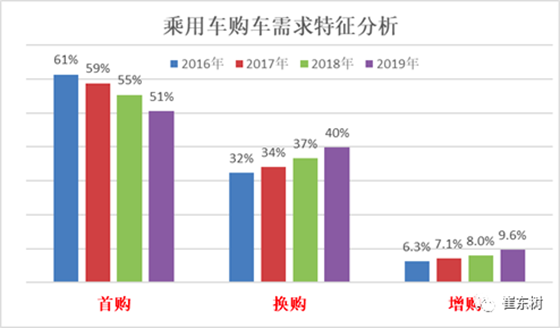 從2016年-2019年,呈現首購逐年下降,換購逐年上升的趨勢。從最近幾年蓬勃發展的二手車市場,其實也可以看出“汽車換購”無疑是汽車增長的增長的巨大動力。換購往往集中在車型、品牌的升級。結婚換車,家庭換車,消費升級換成等等。