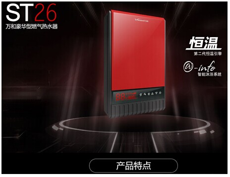 萬和熱水器ST26紅色搶眼的色彩令人驚艷,不經意的一瞥,已經被它奪目的外形小巧的設計所吸引。萬和S級高端智能熱水器,以創新的@-info人機交互系統,搭載第二代 AI智能恒溫引擎和智燃技術專利群,無處不散發著智能自在和格調品位的魅力。其六大顯著的關愛功能主要是多重溫度預設、DIY浴缸注水、實時耗能顯示、防凍預警、兒童防燙鎖以及遙控呼叫。