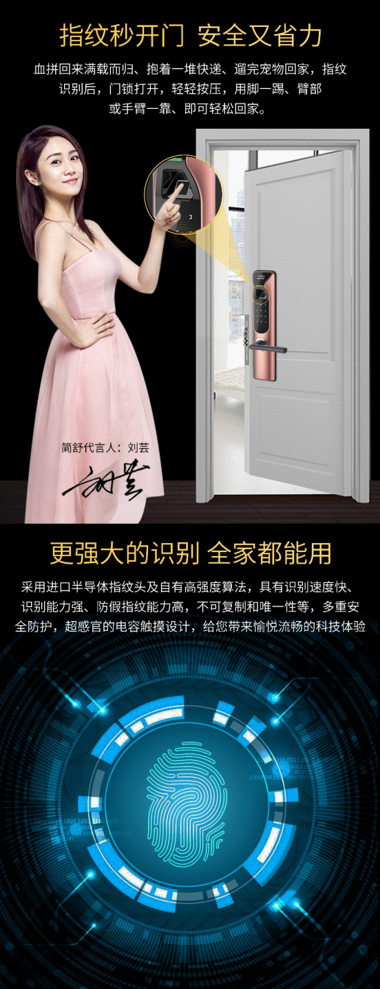 0.3秒快速開鎖,簡舒指紋鎖采用進口半導體活體生物識別技術,自有高強度指紋算法,具有識別速度快、識別能力強、防假指紋能力高、不可復制和唯一性等特點;多重安全防護,超感官的電容觸摸設計,給用戶帶來愉悅流暢的科技體驗。