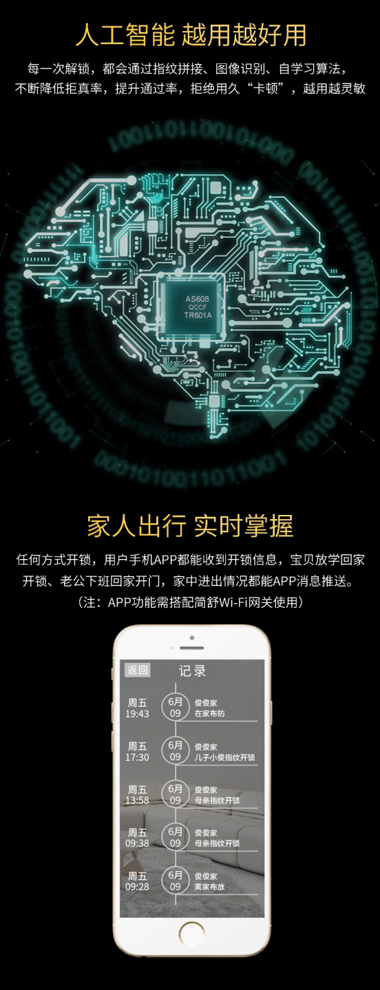 這個功能非常的實用,作為家庭主人,我們經常想知道小孩放學了是否回家了;母親出去買菜了,擔心到底回來了沒;老公今天加班了沒,有沒有應酬,按時回家了沒等等類似的情況。簡舒物聯網智能鎖S007貼心的為用戶設計了開門信息推送提醒功能,也就是說任何方式開鎖,您和家庭成員都能收到開鎖信息,寶貝放學回家開鎖,老公下班回家開門,家中進出情況都有APP提示。(須搭配簡舒Wi-Fi安全小衛士)