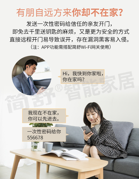 是本次風險監(jiān)測發(fā)現(xiàn),搭載人臉識別功能和遠程開鎖功能的智能門鎖安全風險較高,建議消費者盡量不使用或關(guān)閉人臉識別功能和遠程開鎖功能。大部分的廠家采用的是“使用一次性臨時密碼開鎖”,使用臨時密碼開鎖與直接遠程開鎖有些不同,當有客人來訪時,需要來訪客人跟主人進行通話,再由主人派發(fā)一次性的臨時密碼給來訪客人,客人需在智能鎖上輸入臨時密碼后方可開鎖,一般臨時密碼的有效時間最長為5分鐘,而且臨時密碼隨機產(chǎn)生,如同驗證碼一樣,隨機性和耦合性比較強,安全系數(shù)高。簡舒智能門鎖就是使用一次性臨時密碼開鎖非常的方便。