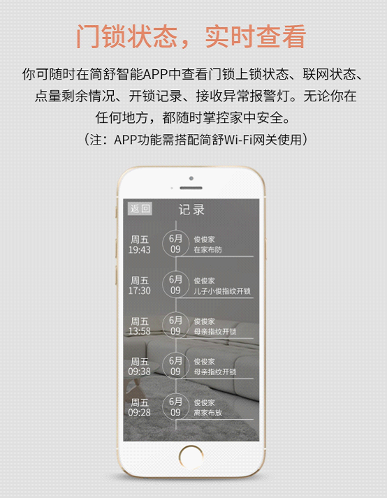 建議選購具有輸入錯誤報警和防破壞報警功能的智能門鎖,當連續(xù)多次實施錯誤操作或防護面板遭受外力破壞時,智能門鎖應(yīng)有相應(yīng)報警信號提示。這一點非常的重要,智能鎖需鎖具本身自帶防暴力開鎖的功能,簡舒智能門鎖自帶四大安全傳感器,其面板防撬檢測傳感器,一旦有人撬鎖,立即觸發(fā)防拆報警;C級鎖芯,四面雙葉片,防小偷技術(shù)開鎖;指紋密碼磁卡,雙重驗證,提高特殊場所的安全等級;32位虛位密碼,防止有人偷窺密碼,提高安全等級;游離式把手,一旦暴力破壞,也不傷及簡舒智能鎖的內(nèi)部結(jié)構(gòu)。
