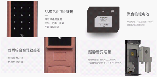 Hobere-H5采用5A級鉆化鋼化玻璃,可達到耐刮、耐磨、耐臟的絕佳效果;采用優質鋅合金材質的面板,硬度、強度高,且雅致美觀,視覺效果強;采用聚合物鋰電池,節約環保,安全可靠,使用壽命長;采用超靜音變速箱,超高級扭力,超充沛動力,開門順暢;采用經過特殊防水防潮處理的電路板,經久耐用。