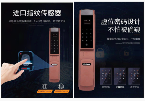 (2)密碼開鎖:Hobere-H5虛位密碼設計,有效防止外人偷窺,且連續5次密碼驗證失敗,智能鎖會自動報警并鎖定系統,讓“不法分子”無機可乘。