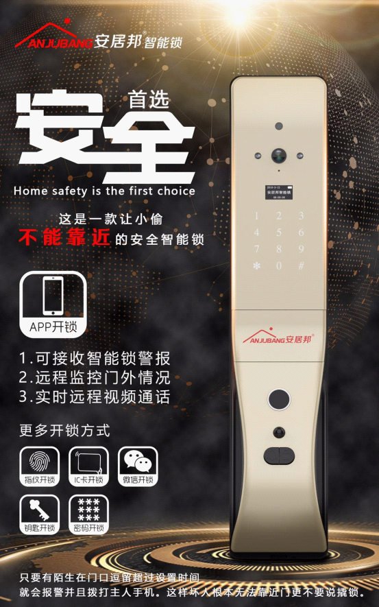 然而,消費者在選購智能鎖的時候,有人關注外觀,有人關注功能,有人關注價格,但是更多人關注的是智能鎖的安全性,目前市場上很多品牌都在打安全牌,有的品牌說他們采用的是C級鎖芯,有的品牌說他們采用不銹鋼304鎖體。而安居邦的A4打造的是一款讓小偷根本無法靠近的真正的安全智能鎖!A4貓眼全自動智能鎖可遠程監控門外情況、若門外有可疑人員逗留,智能鎖會及時向用戶發出安全警報,絲毫不給“不法之徒”靠近家門的機會。因而,A4產品一上市,便贏得了廣大消費者的青睞與支持。
