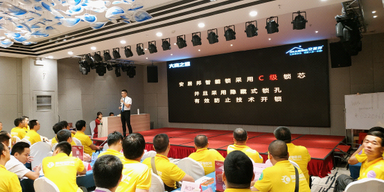 在“生產揭秘之旅”過后,內容豐富的安居邦交流會正式開始!伴隨著熱烈的掌聲,安居邦市場部湯經理上臺圍繞安居邦智能鎖產品的功能、亮點、賣點等幾大方面展開了深入淺出的精彩演講,成功贏得全場雷鳴般的掌聲!