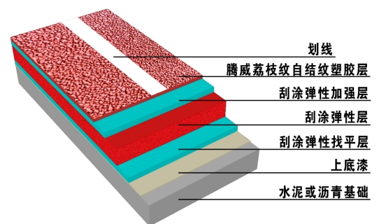 騰威全塑型自結紋跑道是一種彈性層采用雙組分硅PU彈性層澆注、面層采用自結紋跑道面層材料噴涂而成。我公司的SiPU全塑型自結紋跑道的彈性層采用標準的13mm厚度、全部由雙組分硅PU彈性層(型號:M9)澆注固化而成,不添加任何橡膠顆粒;跑道面層構造厚度2.5mm,選用雙組分自結紋面層S-10噴涂而成,面層噴涂時不需要添加任何橡膠顆粒,自動會生成美觀的荔枝紋效果,增加跑道表面的摩擦系數。