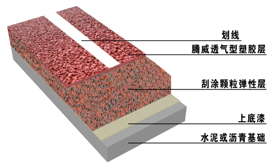 透氣型塑膠跑道,是世界上最廣泛使用、最經濟的跑道結構,是由EPDM彩色橡膠顆粒與單組份膠水混合而成,因成型后呈孔隙結構,空氣、水分可以貫通,故稱為透氣型,國內約60%的塑膠跑道都是透氣型塑膠跑道。