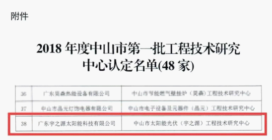 近日,廣東宇之源太陽能科技有限公司成功被中山市科學技術局認定為“中山市太陽能光伏(宇之源)工程技術研究中心”。這一榮譽的獲得,既是政府及社會各界對宇之源整體技術水平的肯定和認可,也是對宇之源科技創新工作的鼓勵和支持,標志著宇之源的技術研發能力已經邁入新的臺階。