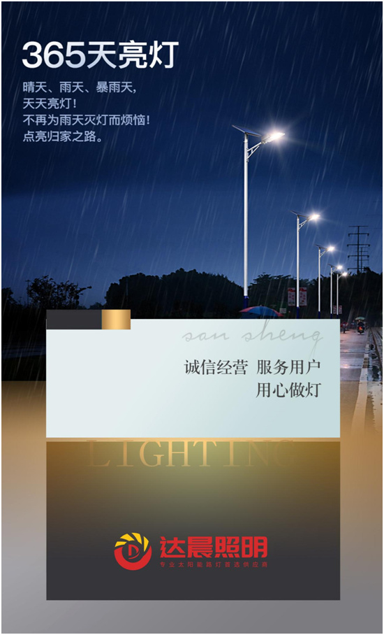 太陽能路燈能夠擺脫電力的控制和束縛,避免了交流電不穩定帶來的光照亮度不穩定、斷電等情況,還不用擔心用錯峰用電帶來的供電困難。達晨興”太陽能路燈,卓越品質,確保全年亮燈、整晚亮燈,讓太陽的光輝在黑暗中延續。