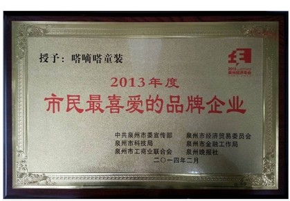 一個企業的經營和運作關鍵是要看企業的執行者和全公司一起努力才能得到這個企業是否能獲得被大家肯定,而一些有實力和實干的企業在打拼的過程中認能得到消費者的認可。就像中國十大童裝品牌的嗒嘀嗒一樣,在2月27日榮獲共泉州市委宣傳部、泉州市經濟貿易委員會、泉州市科技局、泉州市金融工作局等聯合舉辦的泉州經濟年度峰會“2013年度市民最喜愛的品牌企業”。