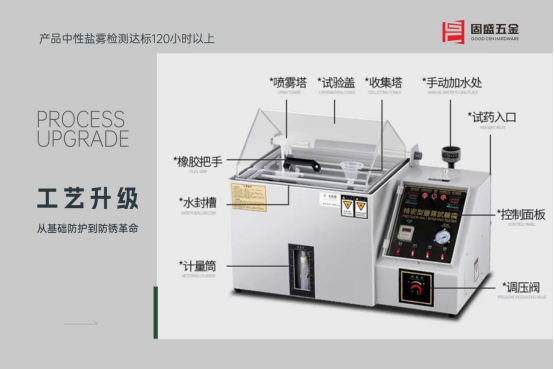 固盛五金對品質的執著,首先體現在電鍍工藝的階梯式突破中。以核心產品二段力鉸鏈為例,從最初的本色鍍鎳,到進階的槍灰色處理,再到如今的鈦金電鍍,每一次升級都指向更嚴苛的防銹標準。通過三層電鍍防護技術,其產品中性鹽霧檢測達標120小時以上,酸性鹽霧測試突破24小時,真正實現“防銹堪比不銹鋼”的效果,甚至達到“鐵可泡水級別”的全新水準。這種對工藝細節的打磨,讓看似普通的鉸鏈擺脫了“易生銹、壽命短”的刻板印象,成為耐用性的代名詞。