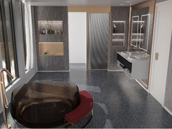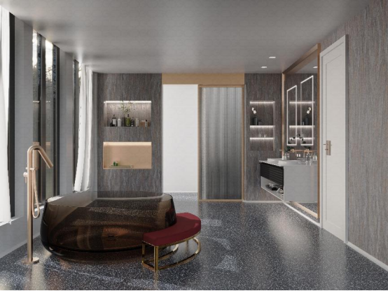 墻面和地面大面積鋪上帶有細膩花紋的人造石,彰顯大氣,其特有的無縫拼接,通體一致,質地均勻的特質,讓整個空間充滿了一體化的藝術感。這樣的裝飾為空間增添了豐富的色彩和紋理層次,使整個空間更具有深度和立體感,打破了空間的單調統一。