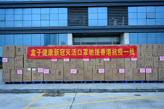 2022年2月18日,為馳援香港抗疫,安徽盒子健康緊急調動生產資源,為香港地區捐助總價值500萬元、全球獨家的新冠病毒滅活口罩。該批物資從瑤海出發于24小時內運抵香港交付,幫助香港人民抗擊疫情。