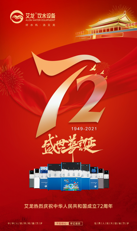 72年,光輝歲月彈指一揮間,72年,中華大地滄桑巨變。2021年我們迎來新中國成立72周年。回望壯闊72年,中國成為當今世界第二大經濟體、中國特色社會主義進入新時代、全面建成小康社會……皆是中華崛起之見證。此時此刻,艾龍飲水設備祝愿祖國蒸蒸日上,再創新的輝煌!