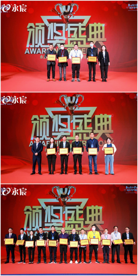 為表彰各位經銷商家人在推廣永宸品牌事業中做出的卓越貢獻,峰會上,黎秋群女士、張亞偉先生、童永平先生依次上臺為獲得榮譽提名的經銷商進行頒獎。此次榮譽獎項包括優秀經銷商獎、品牌傳播貢獻獎和新銳經銷商獎。通過隆重的頒獎儀式,旨在號召全體經銷商家人感受他們拼搏奮斗的精神,并以他們為榜樣,努力為企業作出卓越貢獻。