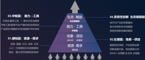 在此規(guī)劃下,平臺提出“項(xiàng)目即場景”理念,圍繞科研、技術(shù)、人才、產(chǎn)業(yè)、城市的核心主體及訴求,設(shè)計五大場景體系,重構(gòu)對應(yīng)的項(xiàng)目集群及生產(chǎn)導(dǎo)向。經(jīng)由這一步,完成生態(tài)核心訴求的提煉匯總,以及內(nèi)容標(biāo)簽化、項(xiàng)目場景化、用戶集群化的轉(zhuǎn)化處理。