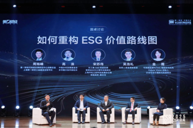 圓桌對話環節以“如何重構ESG價值路線圖”為主題,由第一財經可持續發展研究中心戰略總監、上海第一財經公益基金會秘書長周旭峰與中國鄉村發展基金會鄉村振興協作部處長高浪,長三角G60科創走廊聯席會議辦公室科創組組長、上海市松江區科創發展辦公室黨組成員、副主任宋蘇偉,友邦人壽首席財務官吳浩禮,可持續發展與ESG情報研究機構Future Vision 創始人、企業社會價值研究院副院長金霞共同展開探討。