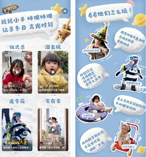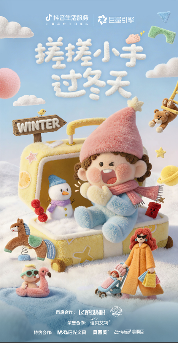 抖音精準挖掘冬日親子家庭的核心需求,捕捉站內「精致生活」「悠閑避寒」「親近自然」「室內撒歡」四大親子生活趨勢,結合平臺創意風格、冬季節點特性與童趣心理,打造“搓搓小手過冬天”親子垂類IP話題,開啟線上“云遛娃”行動。