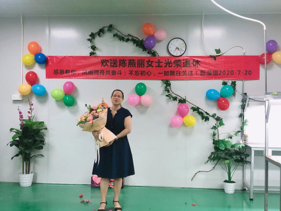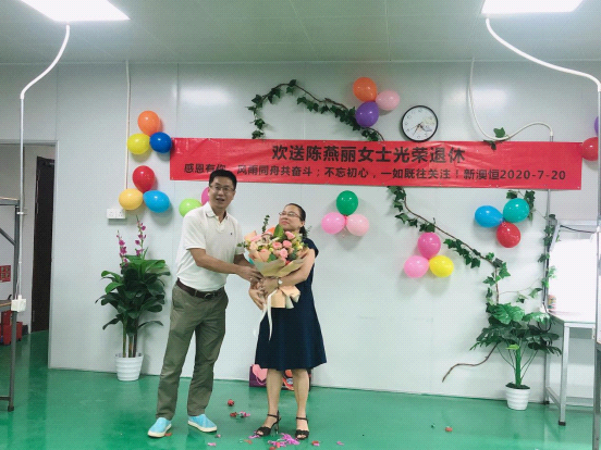 2020年7月16日,一場充滿濃濃惜別之情的退休員工歡送會在新澳恆總部舉行,李廠長與公司員工齊聚一堂,為陳燕麗女士舉行歡送會,感謝她這些年對公司的無私奉獻、默默付出!