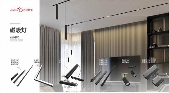 開爾照明針對(duì)居室提供多樣化的場(chǎng)景燈光配置方案。如客廳天花板設(shè)計(jì)嵌入式“回”型磁吸軌道條,搭配升級(jí)款90顯色磁吸泛光燈照明,不僅提供明亮的照明,而且提高客廳的空間感。餐廳沿用了磁吸燈跟深防眩筒燈組合配合照明,保持空間的整體格局,凸顯用餐區(qū);衛(wèi)生間使用低壓燈帶+深防眩筒燈,重點(diǎn)照在壁龕區(qū)、淋浴區(qū)、如廁區(qū)這些需求性照明。
