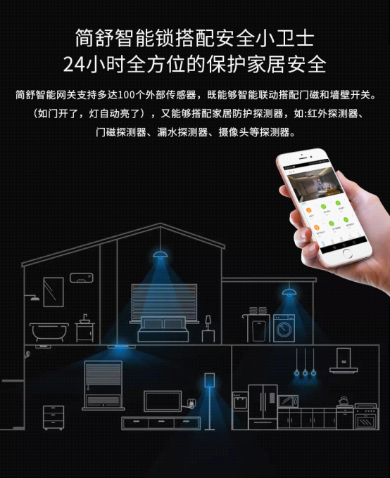 還有更高級的玩法,JIANSHU簡舒S008同樣能與簡舒智家APP上的各類設備聯動,實現一鍵布防。比如,門鎖一旦有異動,會把報警信息發送到簡舒智能網關,人體傳感器會觸發,所有這些設備搜集到信息都可以在app上遠程查看,如此你可以更放心,隨時掌控家中動態。