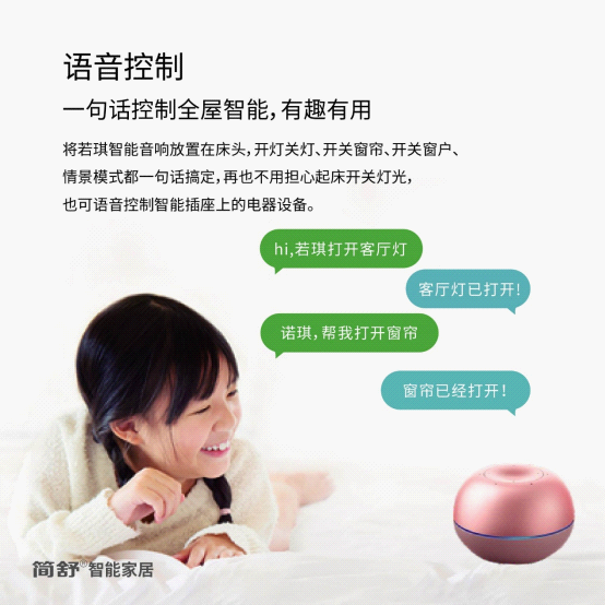 簡(jiǎn)舒Q系列智能開關(guān),讓開關(guān)成為墻壁藝術(shù)品。靈動(dòng)的弧線設(shè)計(jì)、多彩的顏色選擇,簡(jiǎn)舒Q系列藝術(shù)開關(guān)讓我們的家居生活更時(shí)尚、更生動(dòng)、更充滿藝術(shù)感。“簡(jiǎn)舒智家”APP不僅可以遠(yuǎn)程控制開關(guān),而且可以通過天貓精靈或若琪等AI智能音箱的語音控制,“簡(jiǎn)舒,幫我打開客廳燈”“簡(jiǎn)舒,幫我打開書房燈”“簡(jiǎn)舒,我累了想休息了”“簡(jiǎn)舒,我困了想睡了”