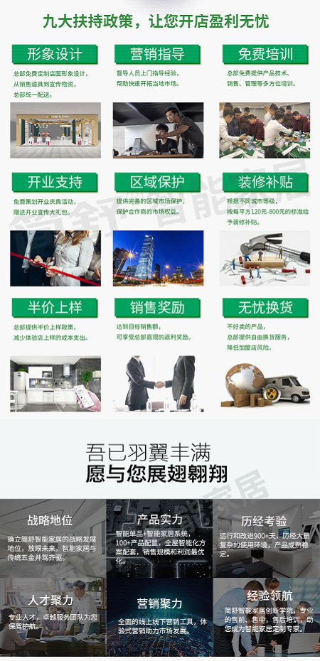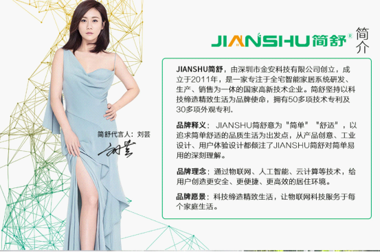 簡舒智能家居作為深圳市金安科技有限公司全屋智能高端品牌,多年來一直在塑造以服務性為主的全屋智能家居品牌,做好服務永遠是第一位,從2011創建公司開始,一直專注于智能家居、智能安防領域,最新研發的LORA全屋智能家居系統歷經三年的突破,正式于2018年上市,并面向全國開始正式招商加盟,雖然期間走了些彎路,但是憑借著強大的研發團隊,以及JIANSHU簡舒智能家居品牌把做好服務和讓合作伙伴賺錢擺在第一位的發展理念,目前全國已經開業的簡舒全屋智能家居體驗店已經達到300+。簡舒全屋智能家居秉承著科技締造精致生活的發展宗旨,把售前、售中、售后服務的每一個細節落實到位,形成了良好的品牌口碑效應,在接下來的2020年,簡舒全屋智能家居將迎來新的躍進,讓每一位選擇簡舒全屋智能家居系統的用戶都體驗到前所未有的幸福生活體驗,同時,簡舒智能家居也有信心、有魄力在幫扶代理商、經理商們的路上砥礪前行,讓每一位加盟簡舒全屋智能家居的創業投資者都成為成功企業家的典范。