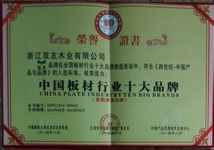 公司順利通過ISO9001質量管理體系認證、IS014001環境管理體系認證、OHSAS18001中國職業健康安全管理體系認證等多項權威認證。“雙友”品牌獲得了中國著名品牌、中國質量500強,中國板材行業十大品牌、中國品牌500強、“質量.服務.信譽.AAA企業”、“中國3.15誠信企業”等眾多榮譽稱號。2011年4月21日獲得中國馳名商標稱號。于2013年央視上榜品牌。