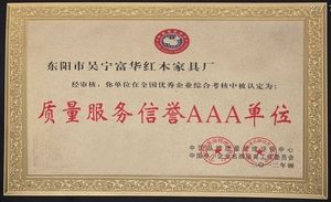 富華紅木以“弘揚紅木家具文化”為己任、以“打造精品家具”為目標,精雕百年紅木,細述千古文化。融古鑄今、大氣天成,數十系列數百款產品,明清民國、中式西式兼容并蓄,有如神來之筆,書就古今中外家具風格之華章。從2008年起,本廠連續3年被東陽市工商局授予“誠信工商戶”;2009年被授予“重質量守誠信優秀示范單位”“中國紅木古典家具理事會理事單位”,并積極參與紅木行業各類活動,獲得“百廠千店無假貨創建活動參與單位”;2012年又榮獲“質量服務信譽AAA單位”等榮譽。