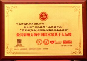 2013年,區氏臻品榮獲2013最具影響力的中國紅木家具十大品牌;