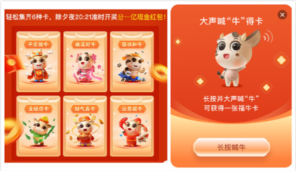 “新春集福牛”作為“養(yǎng)福牛”游戲的接棒活動即刻啟動,“福牛”主題繼續(xù)貫穿集卡的諸多環(huán)節(jié),牛氣一路相伴。運勢超牛卡、財氣真牛卡、桃花好牛卡等6張福牛卡,寓意一舉在微博集齊全年好福氣。1月28日開始,網(wǎng)友進(jìn)入集卡大廳,通過完成相關(guān)線上任務(wù)獲得福牛卡。今年還特別設(shè)置了喊“牛”得卡的全新創(chuàng)意玩法,網(wǎng)友只要對著手機(jī)麥克風(fēng)喊“牛”,就可以得到一張福牛卡,喊“牛”讓集卡過程更加妙趣橫生。