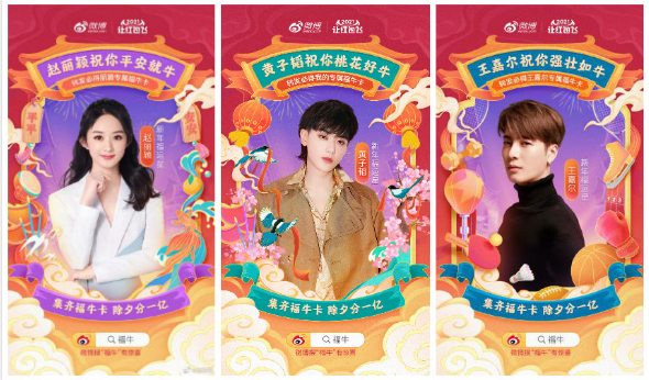 “養(yǎng)福牛”游戲讓福牛星推官們玩得不亦樂乎,“新春集福牛”環(huán)節(jié)同樣少不了明星的助陣,網(wǎng)友只要轉(zhuǎn)發(fā)明星指定微博,就可以得到明星專屬卡。@趙麗穎、@YKYBtao-黃子韜、@王嘉爾、@鄧倫、@楊洋、@蔡徐坤 6位新年福運星接力發(fā)卡,陪網(wǎng)友一起迎新春。