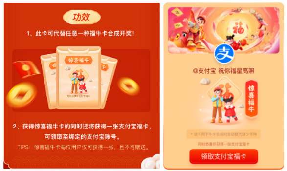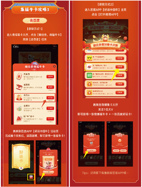 為此,微博攜手百度,為#讓紅包飛#加碼,在活動期間互相增加對方平臺的專項任務(wù),雙重樂趣幸運加倍;同時還與支付寶聯(lián)合發(fā)放“驚喜福牛卡”,在微博完成日常任務(wù)獲得“驚喜福牛卡”的同時也會獲得一張支付寶“五福卡”,“驚喜福牛卡”具備萬能屬性,可替代任意一張微博福牛卡,助力集齊6張福牛卡,瓜分除夕現(xiàn)金紅包。