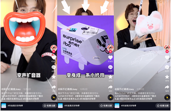 @網不紅萌叔Joey 的短視頻里,社牛張嘴口罩、嘟嘟喵包、變聲擴音器、可以打電話的手套、表情包發卡、凡士林果酸身體乳……多個假日好物從抖音「假日X計劃」禮盒中被開出,吸引17萬人+點贊、4萬+評論熱鬧圍觀。