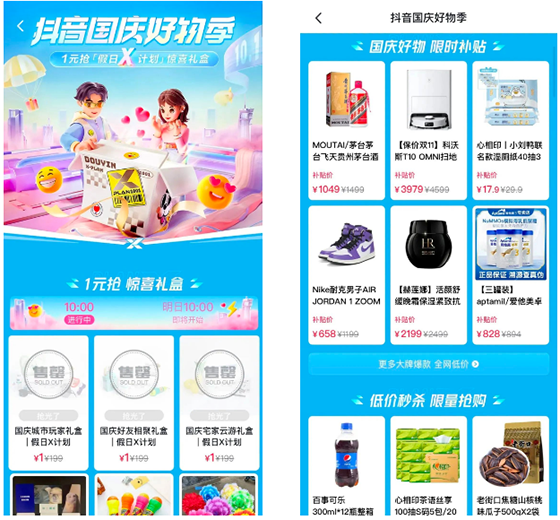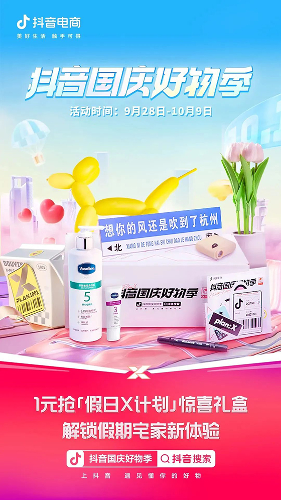 抖音電商于國慶假期推出「假日X計劃」禮盒,引發眾多頭部達人競相參與開箱,一時間#感覺全抖音都收到了國慶禮盒 話題掀起一陣種草風潮。該禮盒在活動主會場只需1元即可秒殺,共包括「好友相聚X計劃」禮盒、「宅家云游X計劃」禮盒、「城市玩家X計劃」禮盒三類,囊括了假日宅家、聚會、出行場景妙趣橫生的百變玩法。