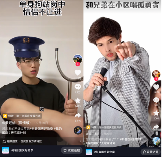此外,「測一測國慶度假方式」 道具貼紙互動,則通過全新的特效玩法與互動形式,為活動的傳播制造了足夠的熱度:和同事在公園“撿垃圾”,和甲方在街頭“談商務”……充滿反差萌與無厘頭的結果讓#抖音國慶好物季 #我的國慶7天宅家計劃等話題,帶動好物生意一起迎來爆發期。