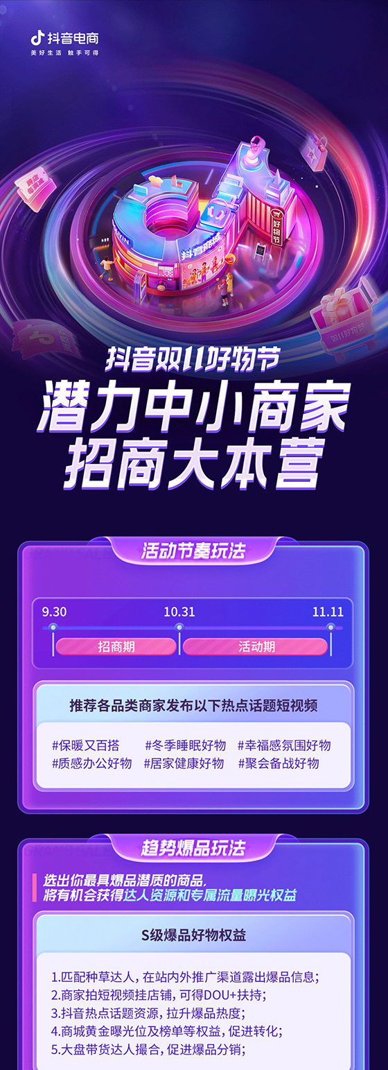 作為電商平臺的“生命線”,潛力中小商家將迎來機遇廣闊的發展機遇期,而雙11無疑是一個引爆生意增長的年度節點。不論是依靠“好物”引爆趨勢爆品消費,還是連接「中心場」與「內容場」的全域玩法,抑或是針對服務商的專屬扶持權益,抖音電商為中小商家搭建起覆蓋全鏈路的權益扶持體系,助其全面釋放生意潛力,在大促節點迎來確定性成長。