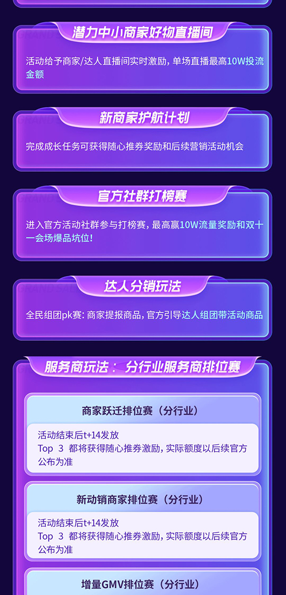 產業帶服務商賽道,分為「商家躍遷排位賽」、「新動銷商家排位賽」、「增量GMV排位賽」三大賽事,各行業Top3服務商將獲得隨心推券獎勵,增量GMV排位賽獲獎服務商還將額外獲得榜單榮譽激勵。