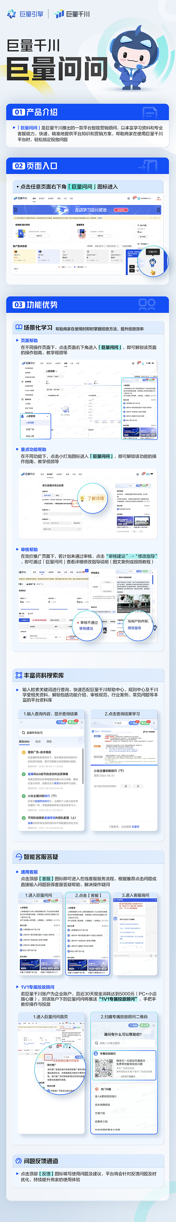 「巨量問問」將陪伴用戶使用平臺,以豐富學習資料和專業客服能力,快速、精準地提供平臺知識和營銷方案,幫助用戶玩轉巨量千川。